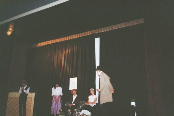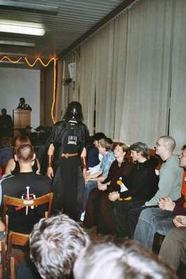 Ještě před druhým divadelním představením jsem odběhla na vyhlášení 1. ročníku fanfiction parodické poesie z prostředí SW - Darth Erben, kde jsem měla dvě "želízka v ohni". Výsledky mě mile překvapily (2. a 4. místo). ;-) Pak už nastal zlatý hřeb večera – ST divadlo Závada není na vašem simulátoru, které bylo součástí zábavného ST + SW večerního programu. Co k tomu dodat? To se prostě musí vidět. Herecké výkony byly skvělé, především Margh exceloval v ženské roli a zcela uchvátil nadšené publikum, ale i všichni ostatní byli úžasní. Po divadelním představení následovaly různé scénky, hrané reklamy, vyhlášení cen Za přínos v SW (tady si nejsem zcela jistá, kdo tu cenu získal, myslím, že Milan Pavlíček), v ST (CZ Kontinuum), E.T. roku (Vašek Pravda) a písničky. Jediným kamenem úrazu a slabším článkem celého večera byla tak trochu kapela. Holodoktor zpívá skvěle, ale zbylý tříčlenný doprovod v čele s Rybininem byl poněkud slabší, především Rybininův zpěv... ;-) Po půlnoci vyrážíme se skupinkou asi dvaceti lidí k záhadnému kulatému objektu měnícímu barvu, který se stal kultovní záležitostí již na loňském FF. Cestou jsme asimilovali skupinku asi deseti nadšenců, kteří si cestu k barevné kouli pro velký úspěch znovu zopakovali. Jsem trochu zklamaná, představovala jsem si, že ten "záhadný objekt" bude větší. Je to koule měnící barvy umístěná v minijezírku, ze kterého neustále vychází pára. Celý zázrak je umístěn na zahradě domku ve stylu podnikatelského baroka na okraji Chotěboře. Ale nevidět to znamená nebýt na conu... ;-)